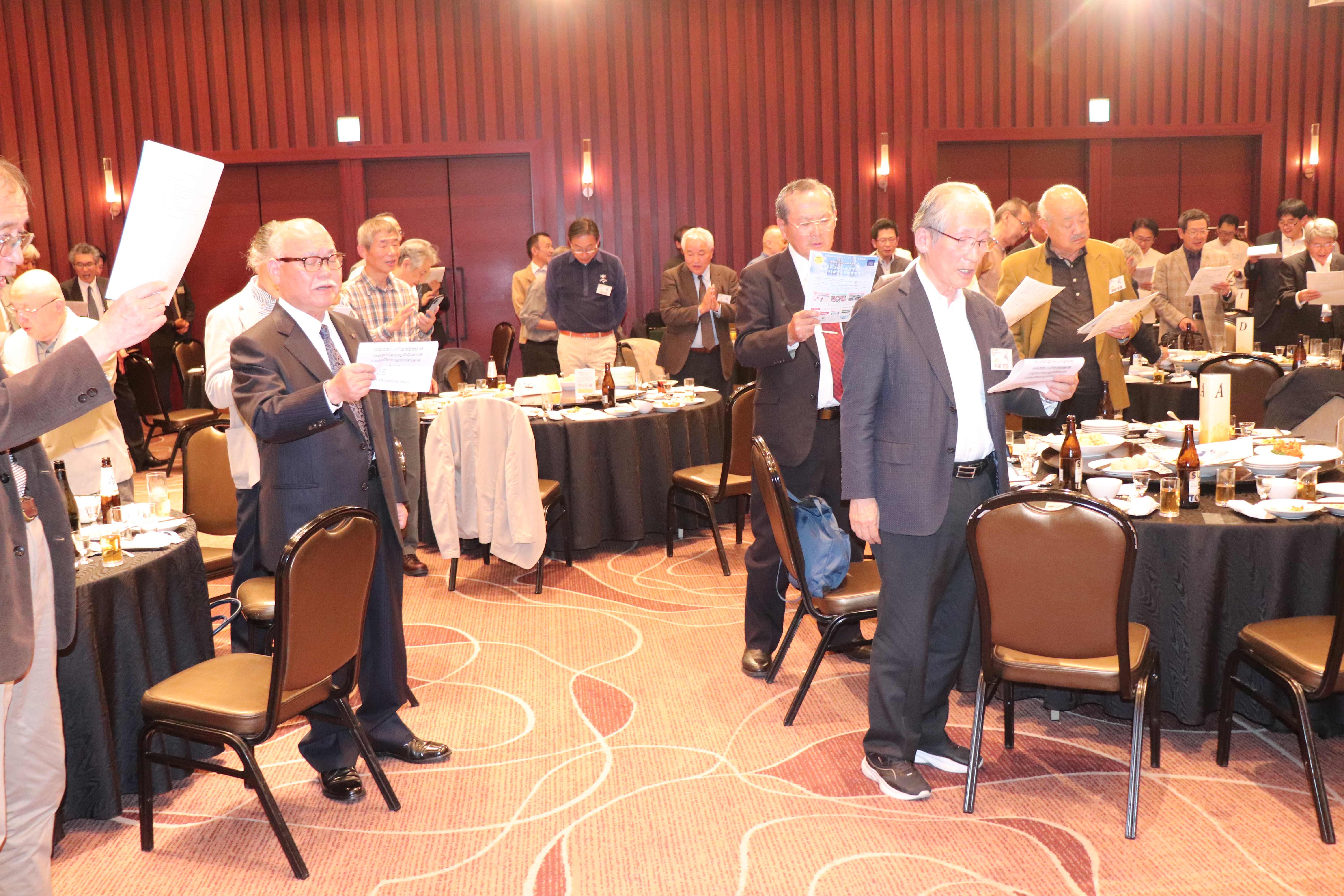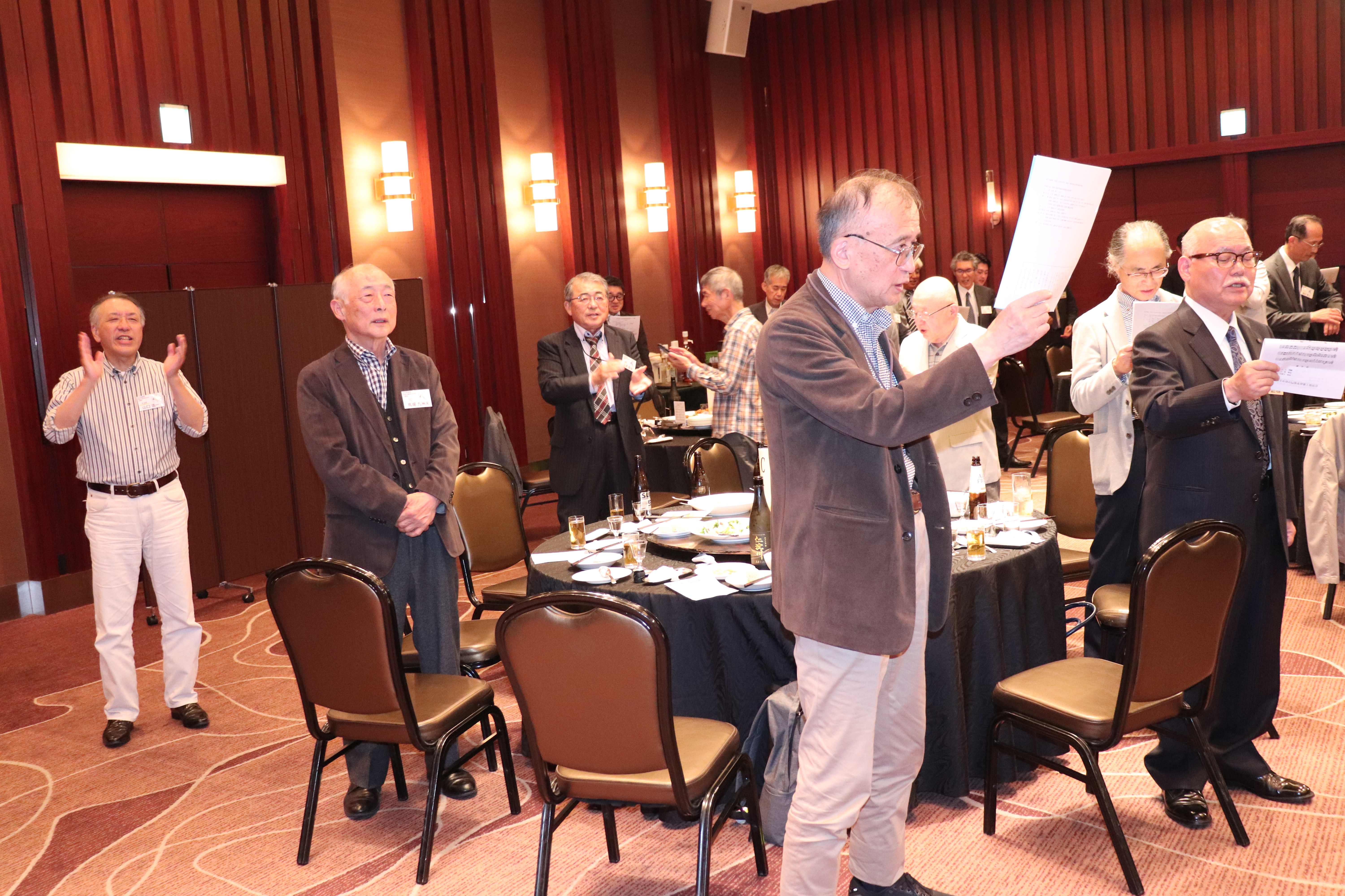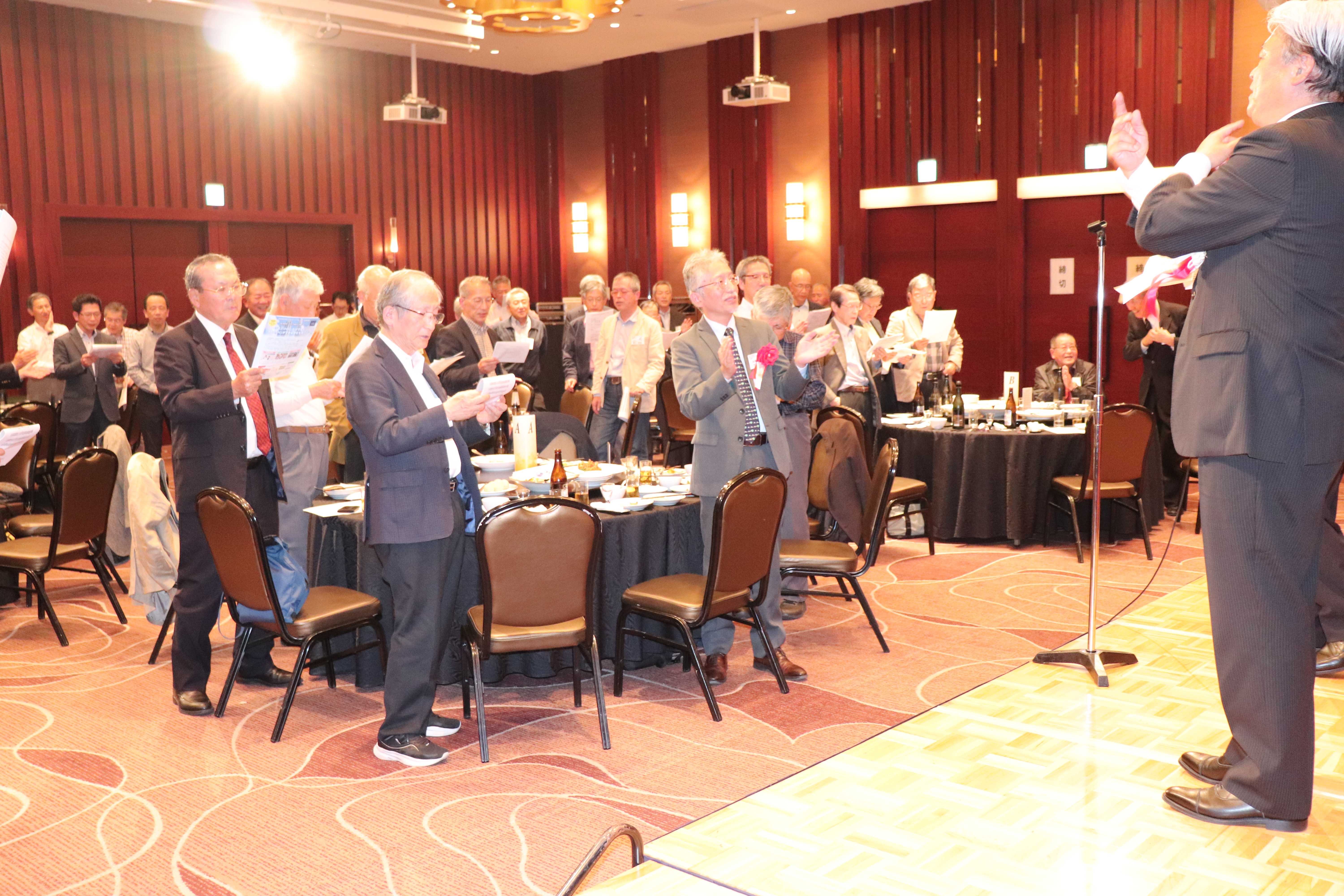 あっという間に楽しい懇親会の時間は終わりに近づき、懐かしい校歌と学生歌を全員で斉唱ししようとしたところ、何と、伴奏用のCDが不調で使用出来ないという事態が発生! CDまでもが終わりたくないとストライキしているようです。 そこで急遽、指揮を13M福田昭彦福岡支部長、斉唱を14E小林茂典さんで行い、何とか乗り切りました。(^^;;