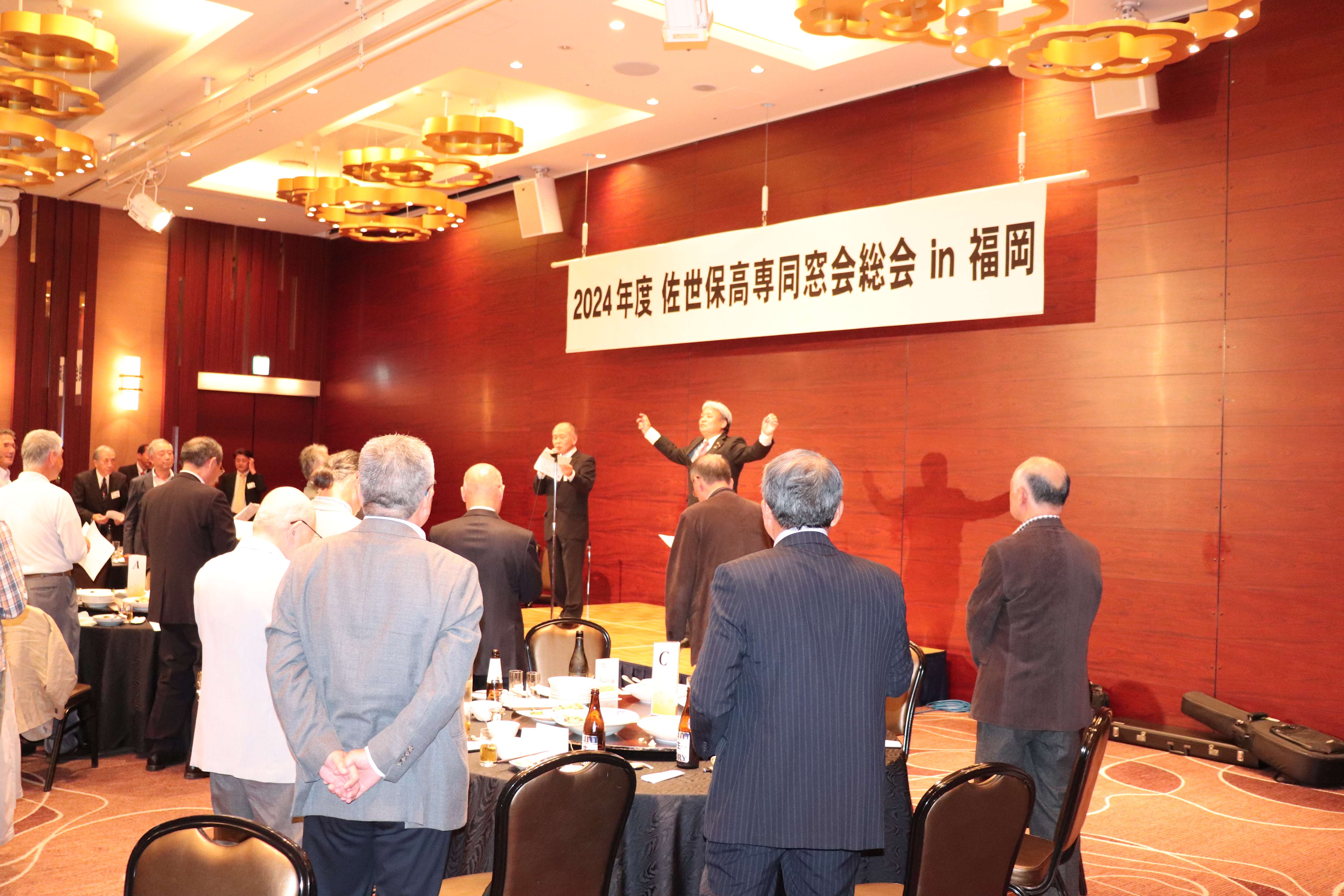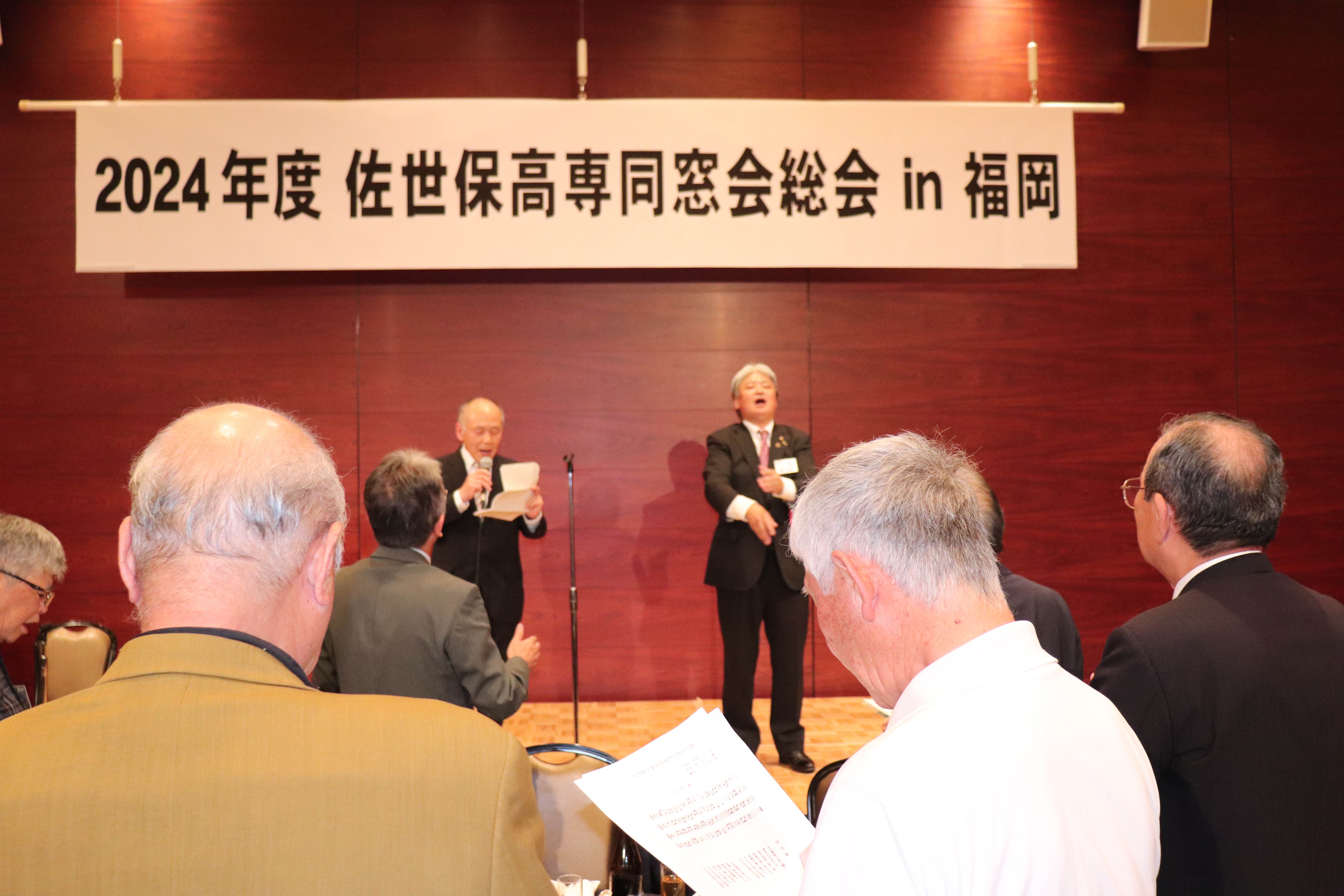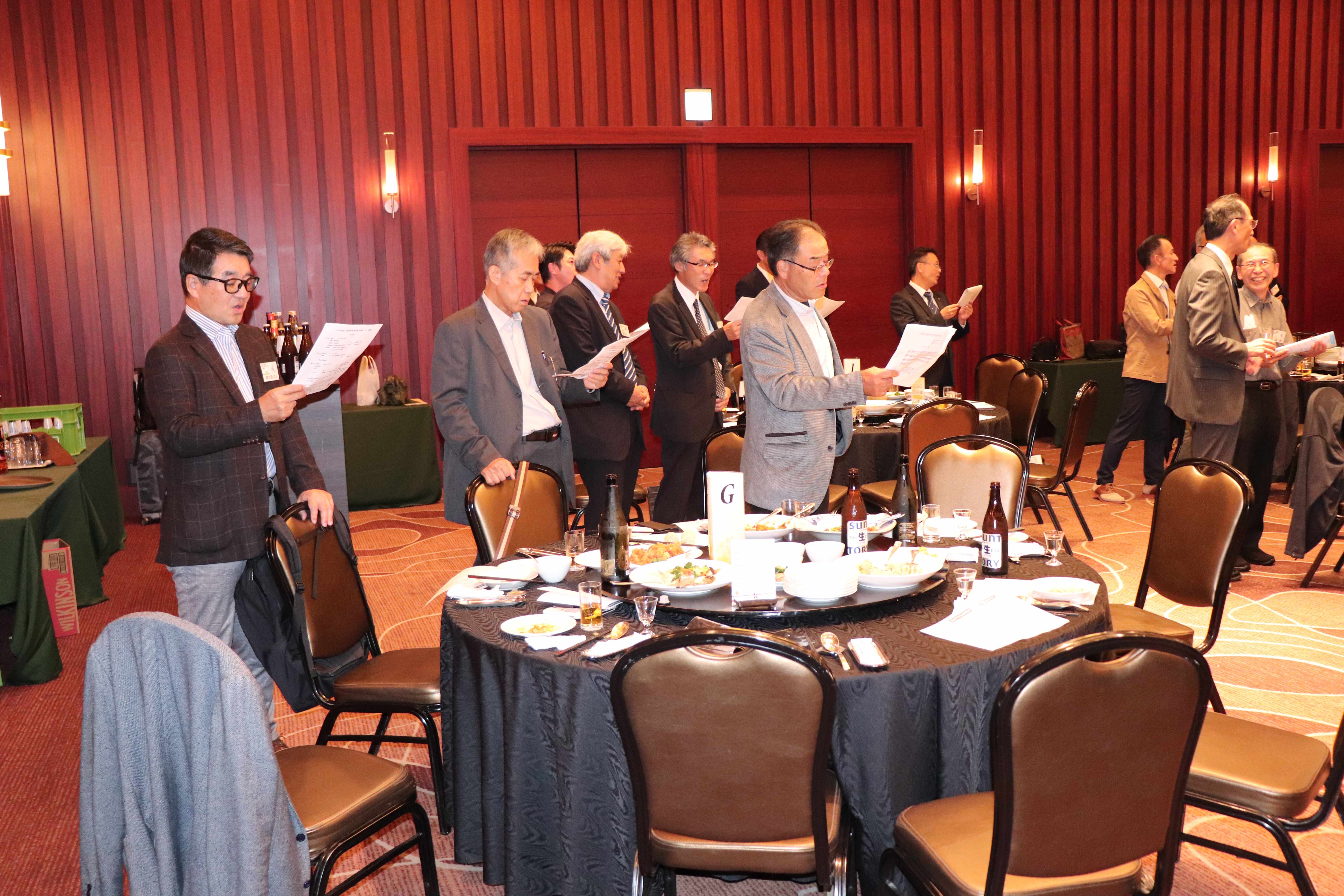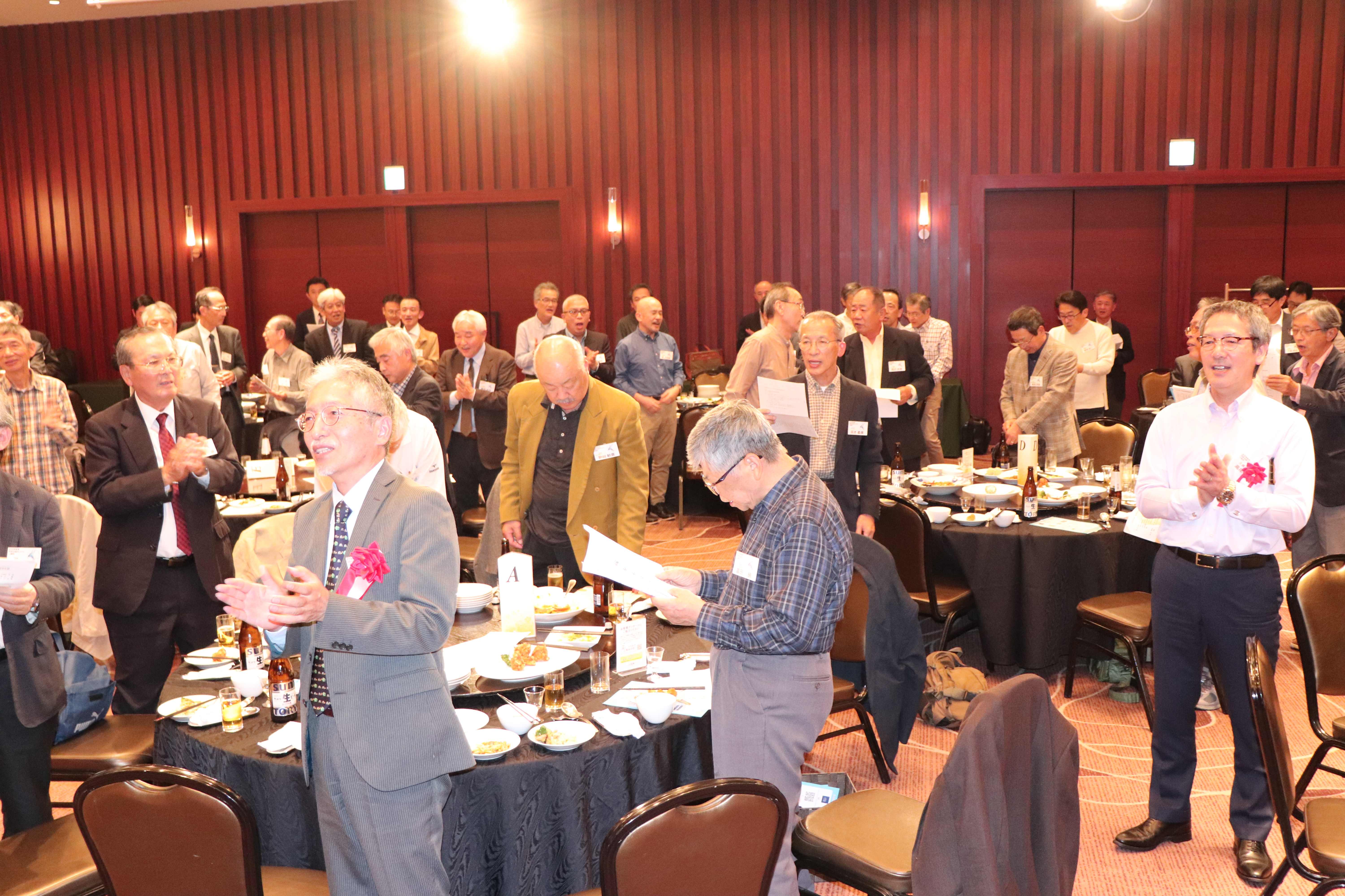 あっという間に楽しい懇親会の時間は終わりに近づき、懐かしい校歌と学生歌を全員で斉唱ししようとしたところ、何と、伴奏用のCDが不調で使用出来ないという事態が発生! CDまでもが終わりたくないとストライキしているようです。 そこで急遽、指揮を13M福田昭彦福岡支部長、斉唱を14E小林茂典さんで行い、何とか乗り切りました。(^^;;