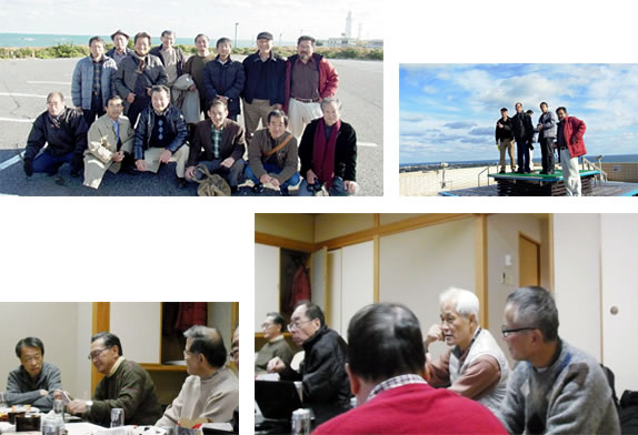 今年の同期会は本州最東端の銚子・犬吠埼で行われました。機械・電気・化学3科合わせて19名の多数の参加者でした。 いつもながらの近況報告をし合い、飲んで食べてただワイワイ・ガヤガヤするだけですが、これが1年に一度のほんとうに楽しいひと時です。 翌日は、電気の志垣さんの勧めで風力発電の風車を見学に行きました。写真にもあるように真下から見上げた大羽根の回転は迫力がありました。 (5M 大石記) |